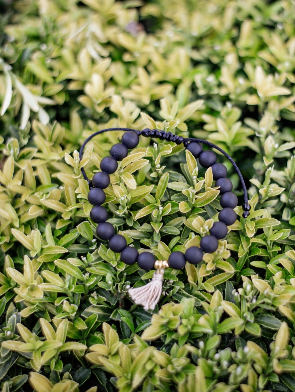 Elegante, simbólica e sofisticada, esta pulseira feita à mão é composta de contas pretas foscas, cuidadosamente montadas à mão. No centro, uma borla dourada delicadamente atada e feita à mão acrescenta um